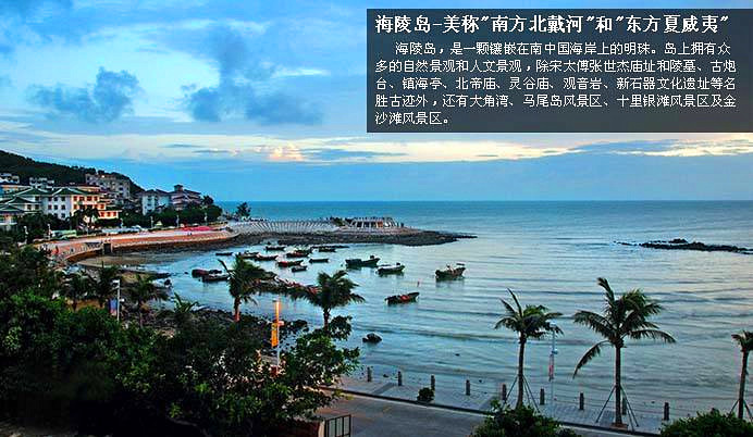 海陵岛位于南海之滨,广东省阳江市西南端,为广东第四大岛。该岛交通便利,经广湛高速公路至广州仅3.5小时,经沿海高速公路至珠海仅2小时,是粤西、粤东、粤中的海上中转站。全岛陆地总面积109.8平方公里,其中主岛面积105平方公里,区域岸线104公里,主岛岸线75.5公里、海域面积640平方公里;有可供开发的土地58平方公里,耕地2.8万亩,浅海滩涂14.7万亩,人口9.03万人。1992618日,经广东省人民政府批准设立海陵岛经济开发试验区,辖海陵、闸坡两镇。海陵岛地处南亚热带,四面环海,山海兼优,年平均气温22.3°С,年降雨量1816毫米,年晴天310,没有奇寒酷署,气候宜人。岛上拥有众多的自然景观和人文景观,除宋太傅张世杰庙址和陵墓、古炮台、镇海亭、北帝庙、灵谷庙、观音岩、新石器文化遗址等名胜古迹外,还有10多处沙滩可供开发为海水浴场,享有"东方夏威夷""南方北戴河"之美称,是一颗镶嵌在南中国海岸上的明珠。