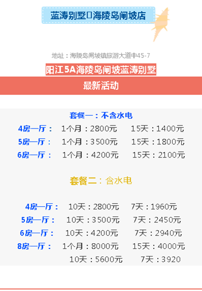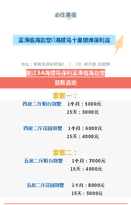 阳江海陵岛蓝涛别墅,位于阳江市海陵岛 闸坡镇旅游大道中45-7,靠近大角湾国家5A级景区,距离闸坡农贸市场开车3-5分钟左右,别墅入口有公交站,可达市场、大角湾、螺洲公园等多个景点,十分方便,周边景色秀美宜人。